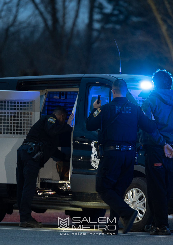At approximately 6:22 PM, Salem Police were dispatched after a caller reported three males with hoods over their heads crawling through windows of a blue building across from a dealership.